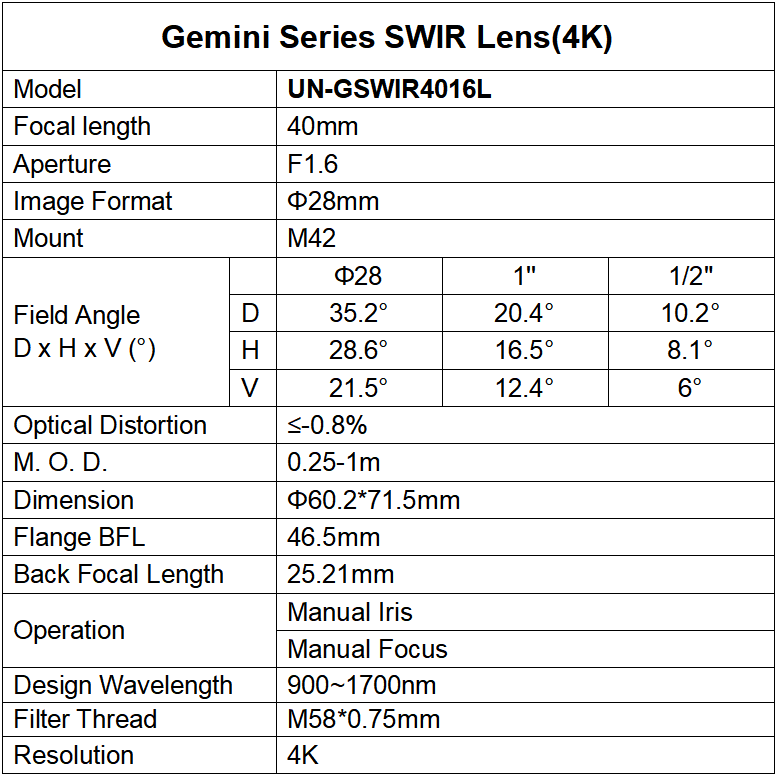 · 1インチ画像フォーマット用に開発 · 波長: 900~1700nm · 大口径、最大F1.4 · コンパクトで軽量な設計