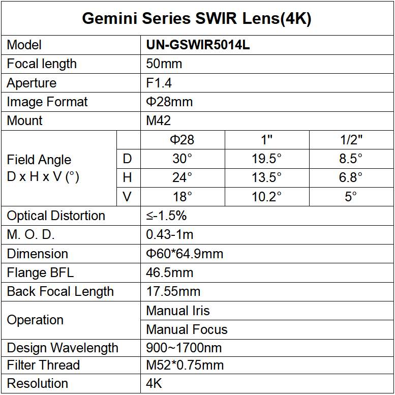 · 1インチ画像フォーマット用に開発 · 波長: 900~1700nm · 大口径、最大F1.4 · コンパクトで軽量な設計